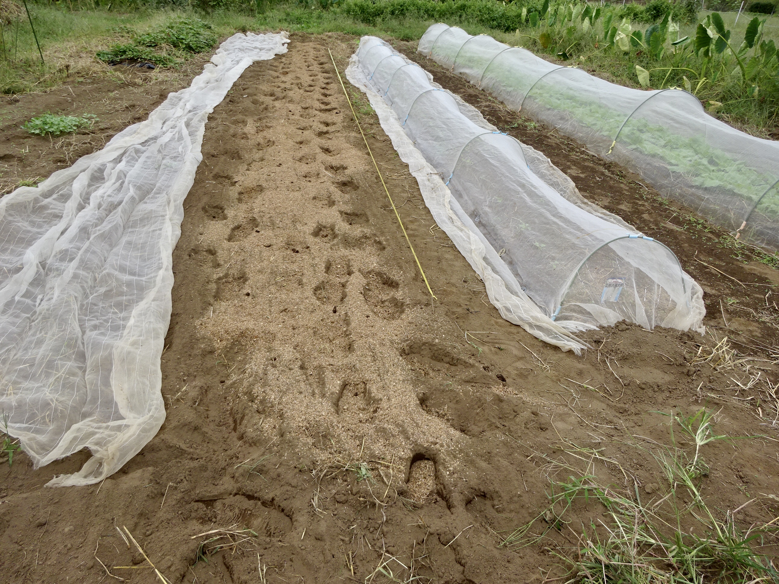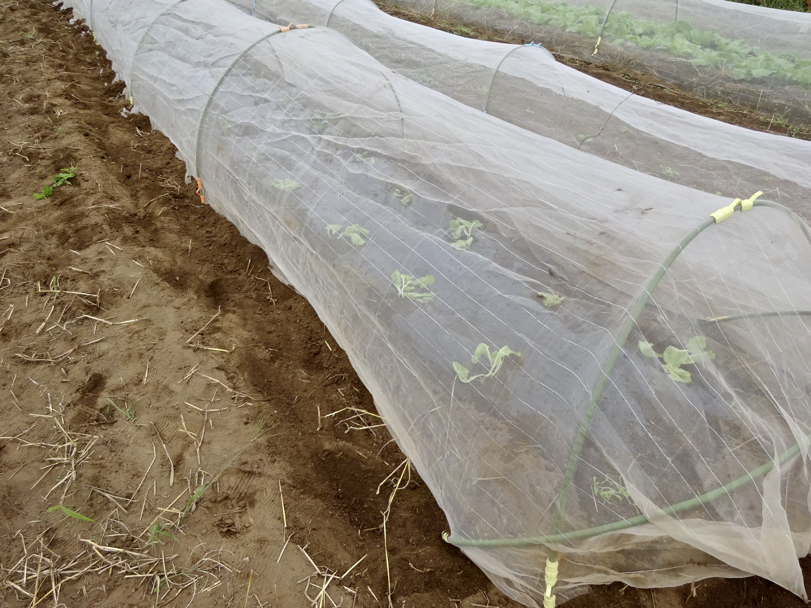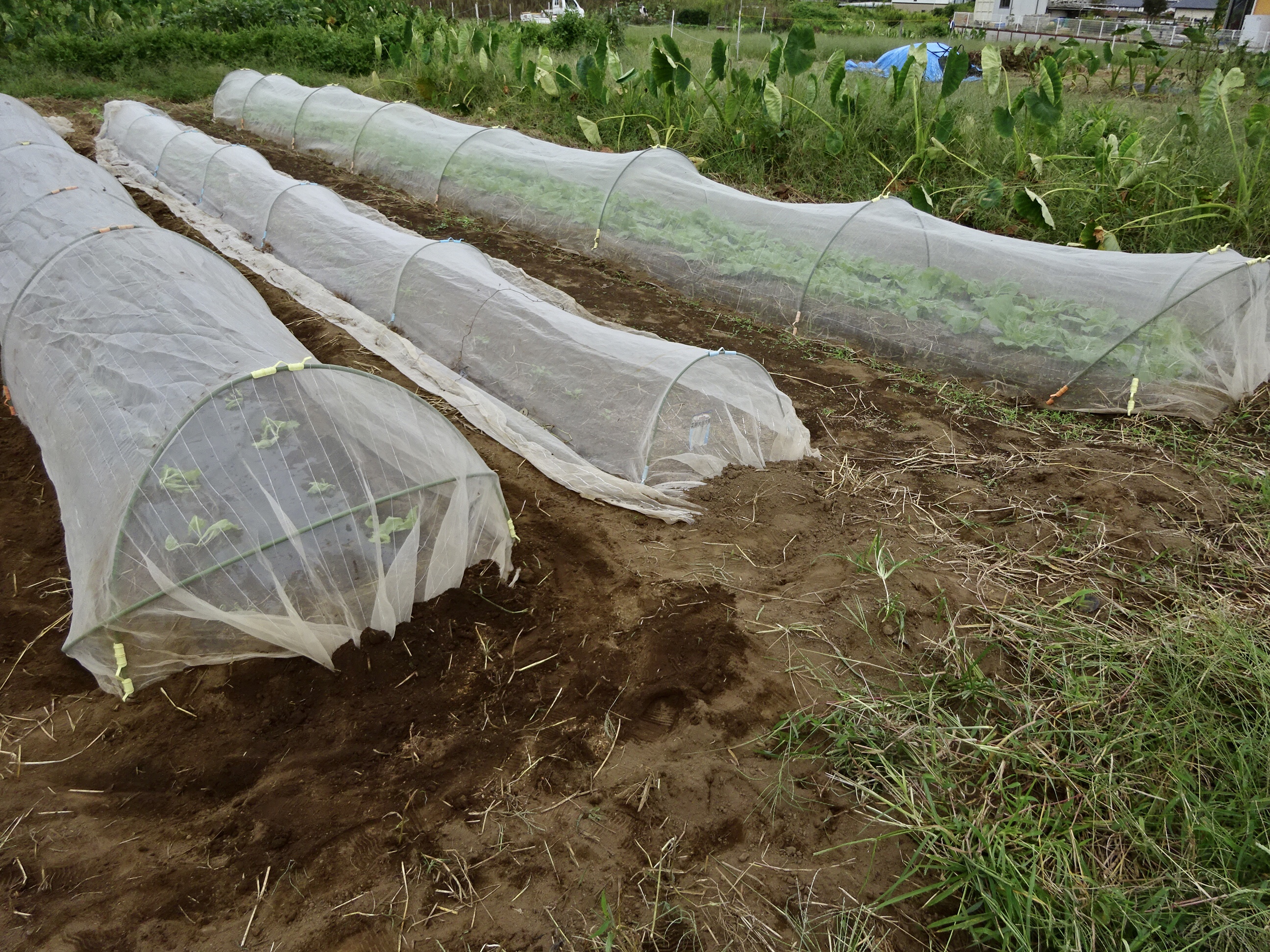 白菜・大根・ブロッコリーなど3本の畝が出来ました。白菜には防虫ネットをかいくぐったコオロギなどが食事したあとが既にあります。白菜の生命力で葉を巻き始めるのを祈っています。地中にもヨトウムシなどがいて食害します。くっそう!