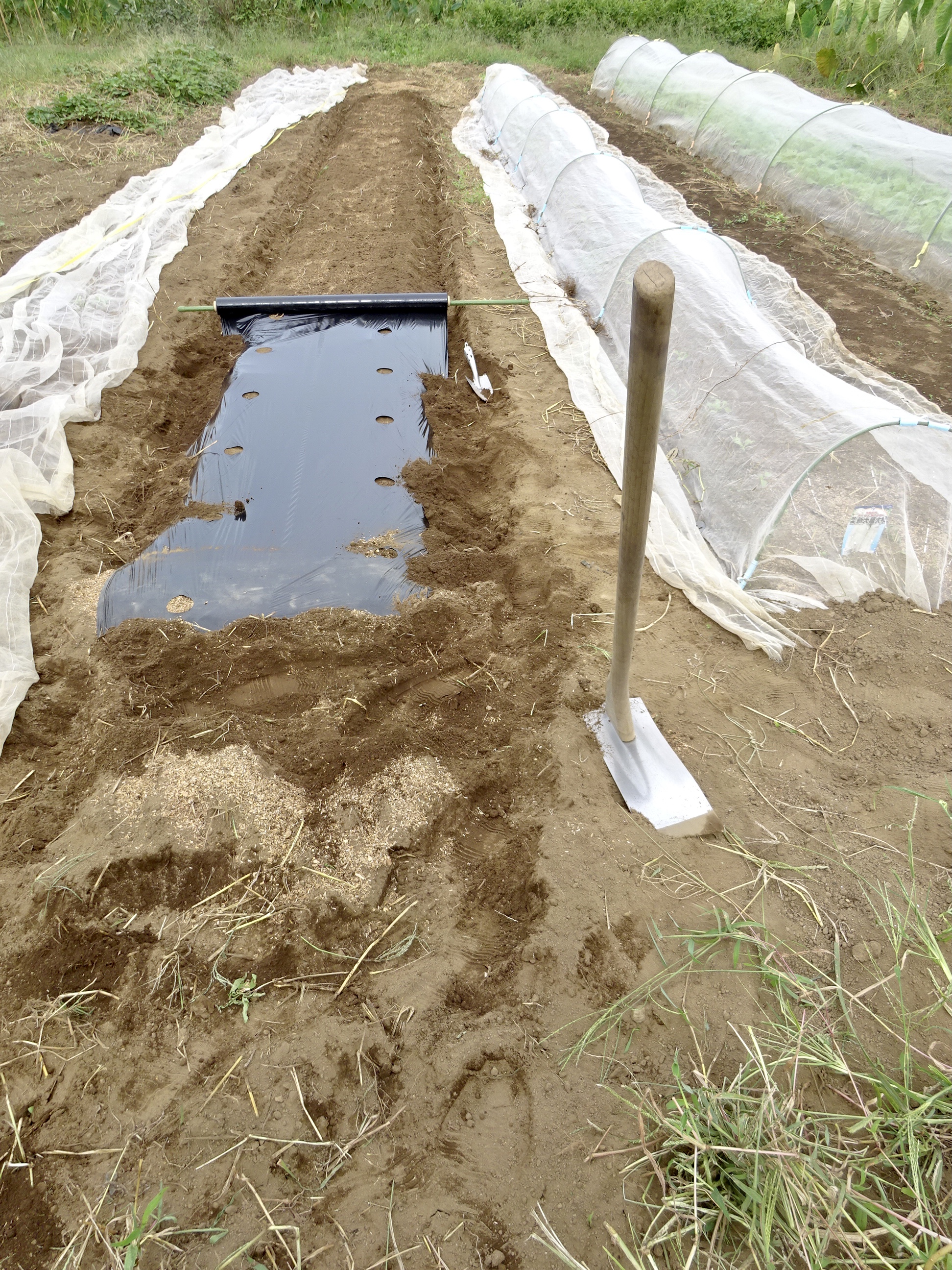 二穴マルチを引いていきます。これが結構つらい。背中も腰も曲がります。