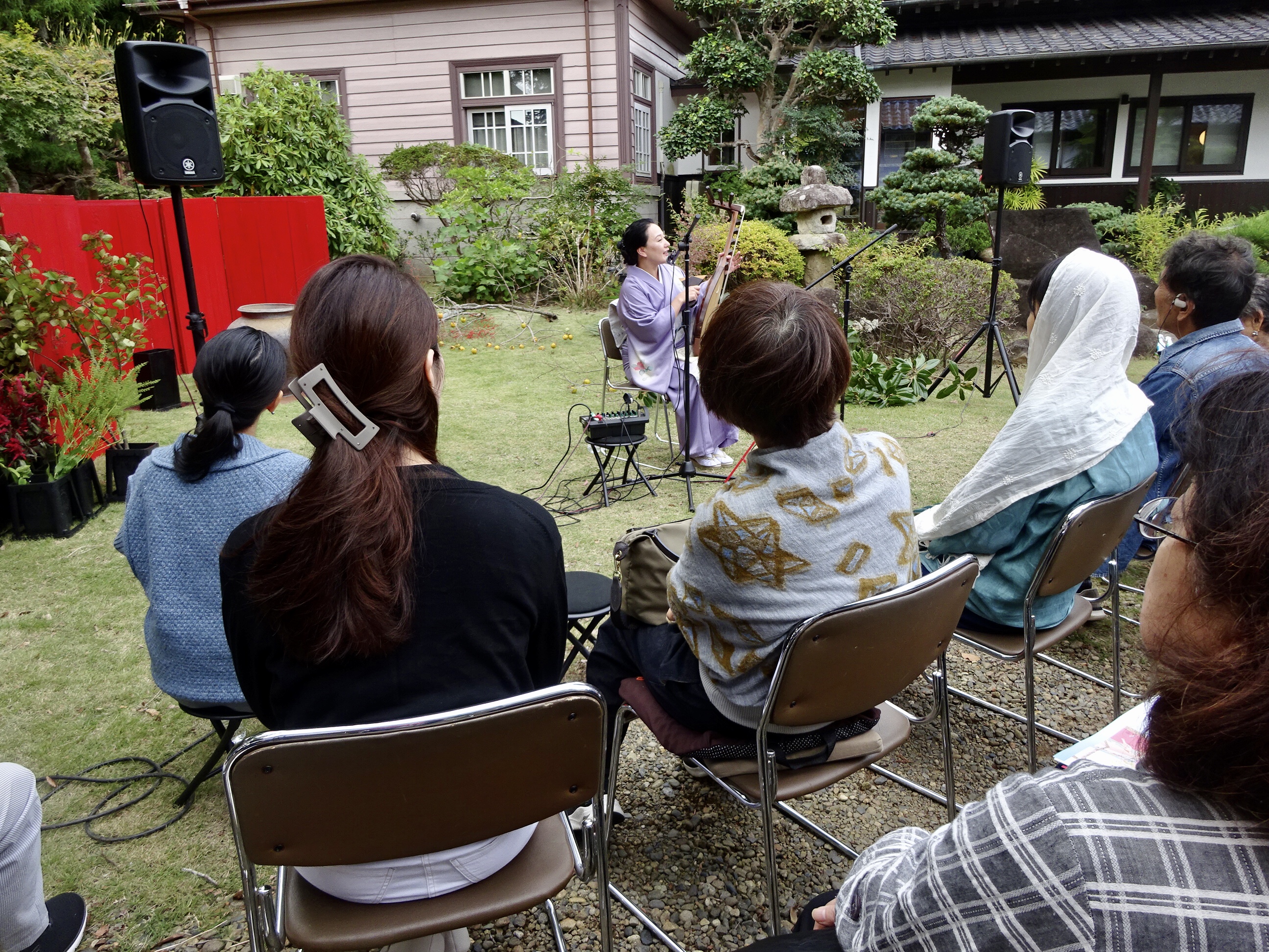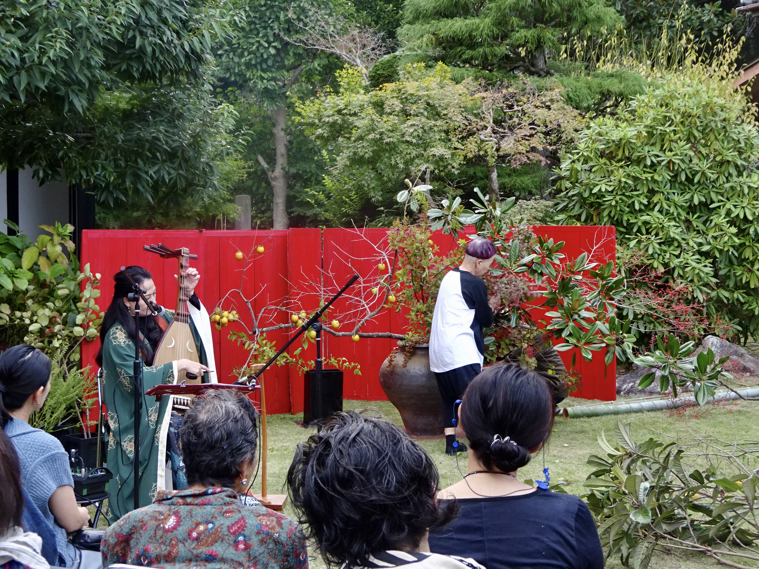 10/13(月)スポーツの日、筑前琵琶の演奏と花いけのコラボレーションを観覧しました。野外での演技でしたが秋の陽がさし台風の影響か多少風が強めでした。薩摩琵琶と筑前琵琶が主だそうで奏者の打越美和子さんは筑前琵琶奏者だそうです。