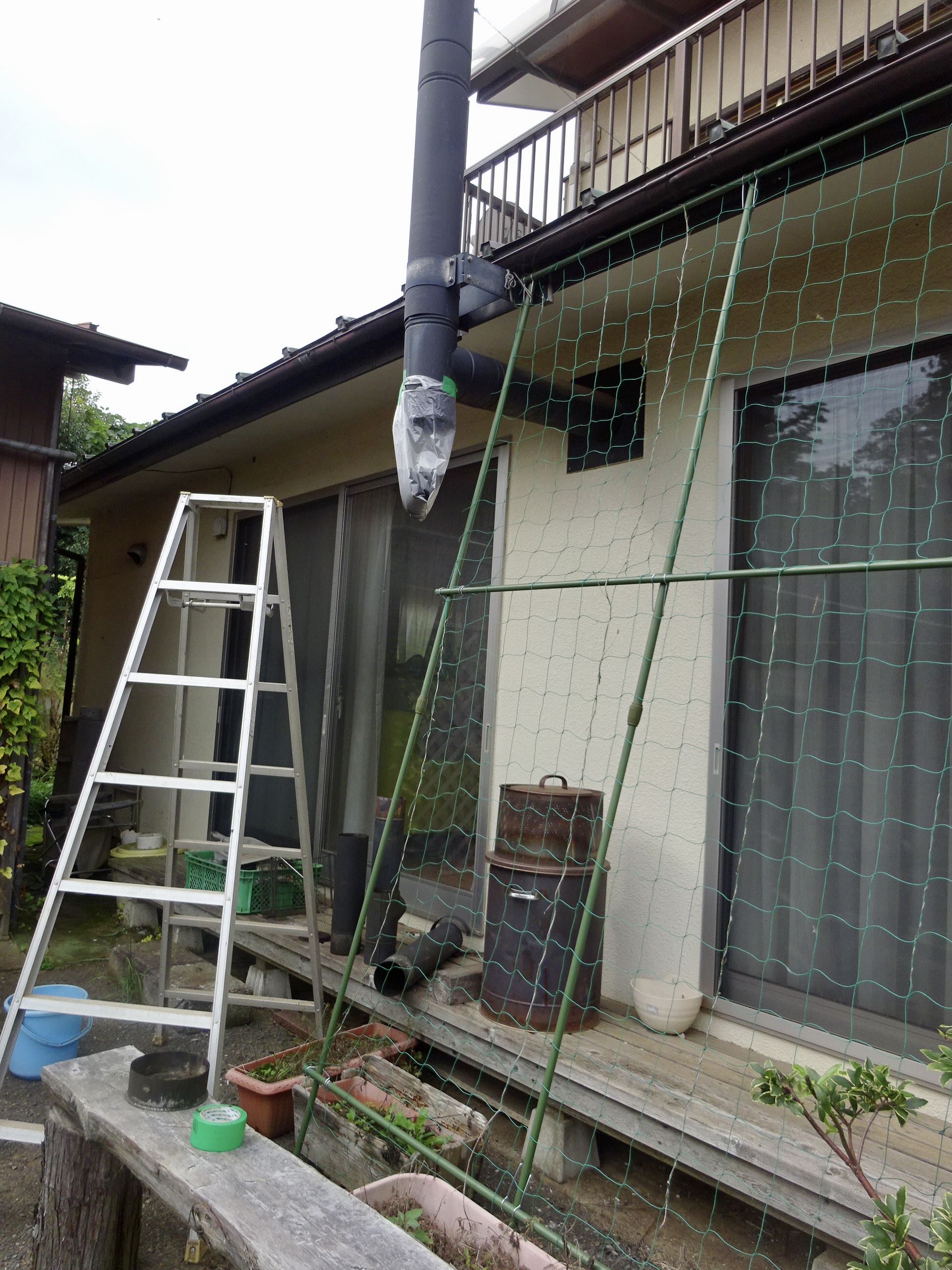 カフェの方は単純で安上がりの煙突だから簡単だが・・油断は禁物!安上がりだから野鳥、特にムクドリが営巣時期に侵入してしまう。