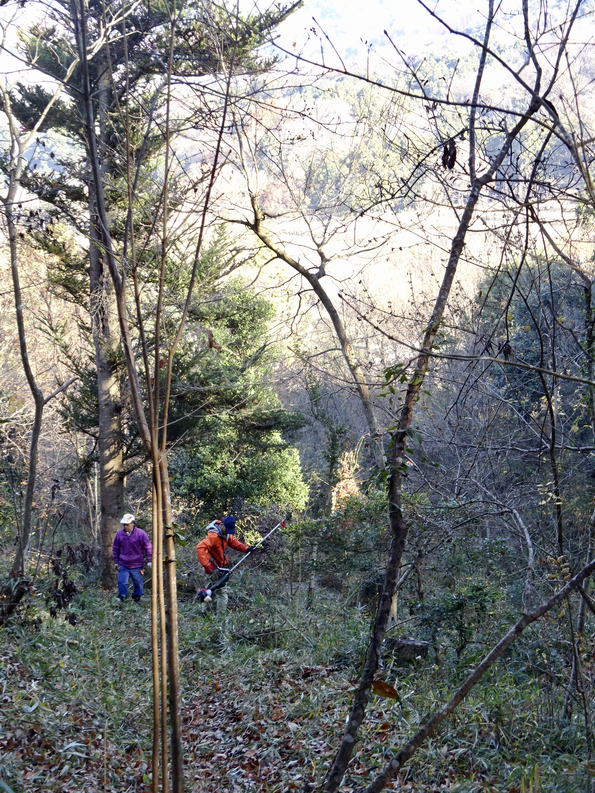 結構な斜度での下草刈りは足腰にこたえます。熊騒動で各地の狩猟者が奮闘中ですがけっこうな高齢者たちが頑張っています。幸いにも熊は棲息していないので安心ですが76歳にはきつすぎるエクササイズです。