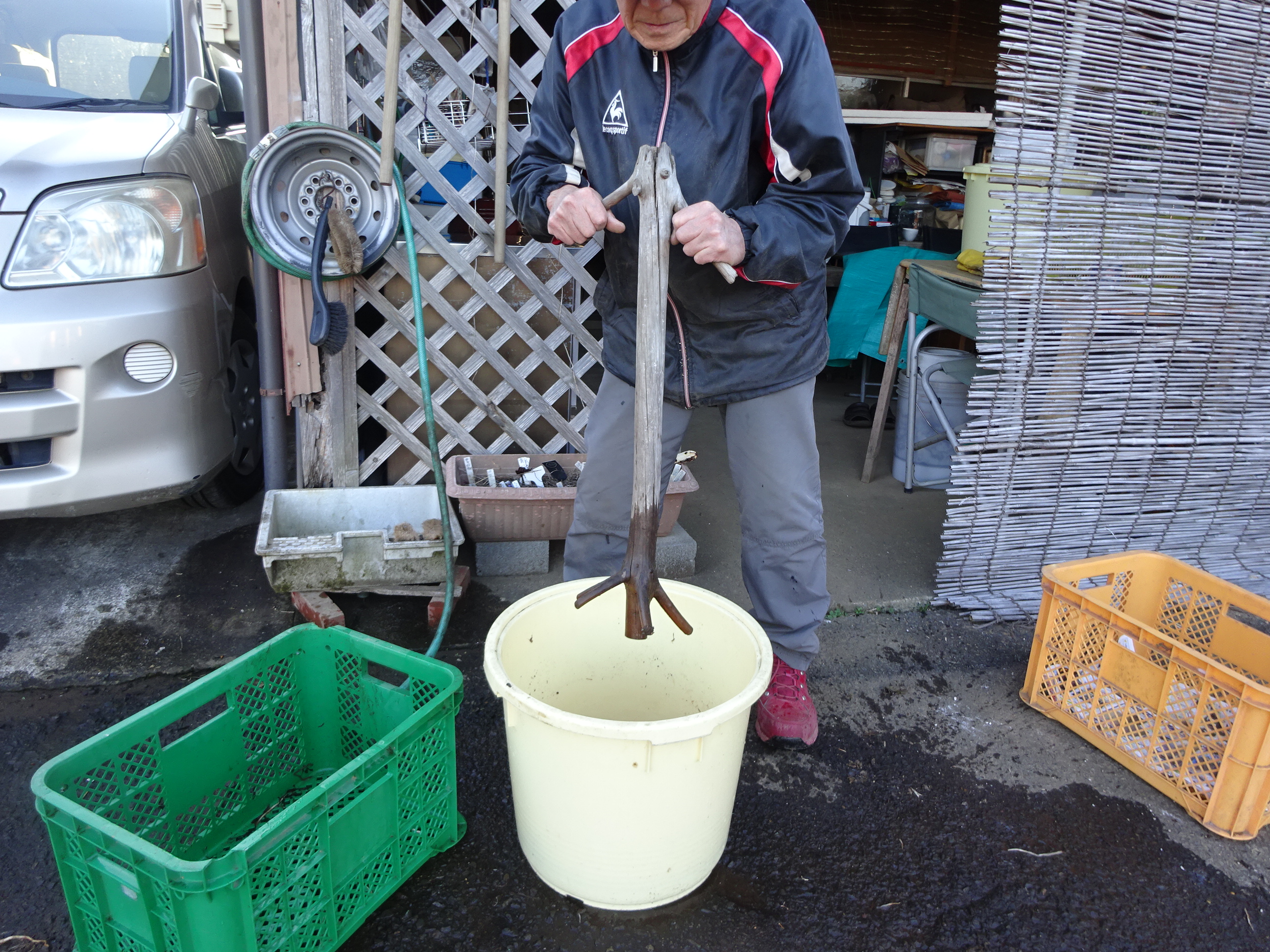 ご覧になったことがおありでしょうか?貴重な民藝農具ですよね。何年前でしょうか?ご近所のおばあちゃんから譲り受けました。里芋など泥付き根菜を洗う道具です。撹拌部分と回転させる取っ手の部分が絶妙な間隔で枝分かれした自然木です。